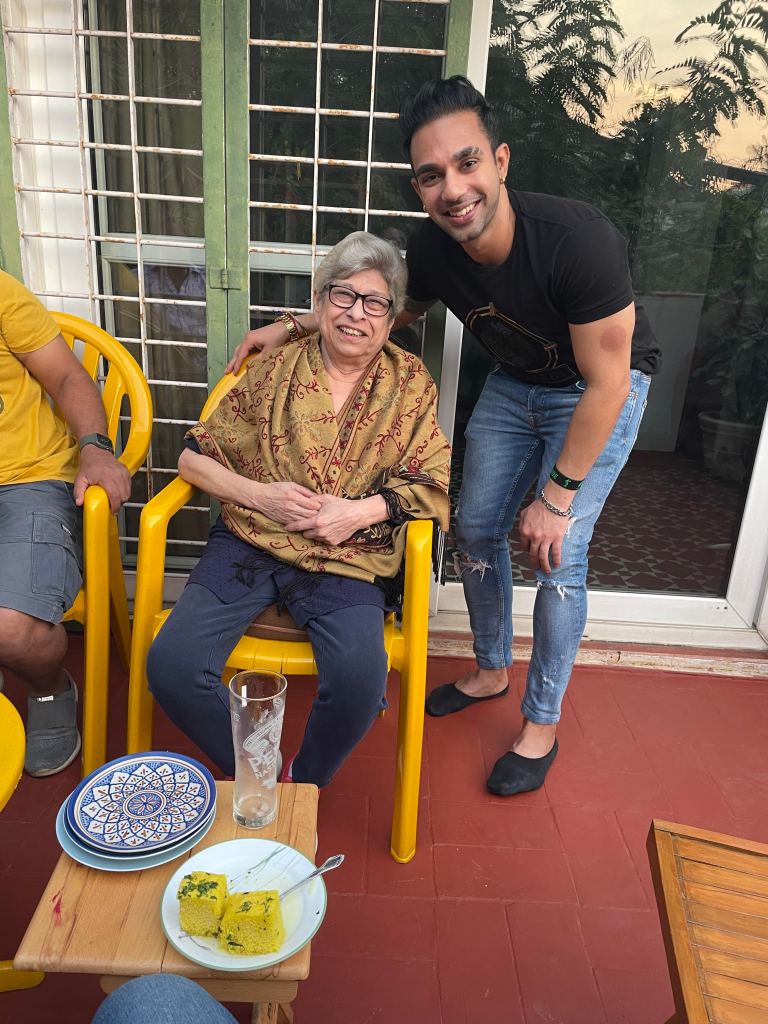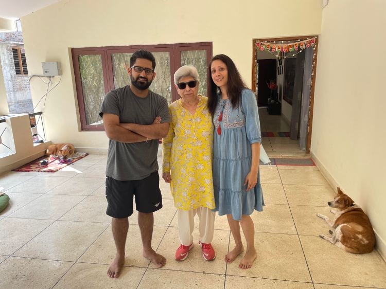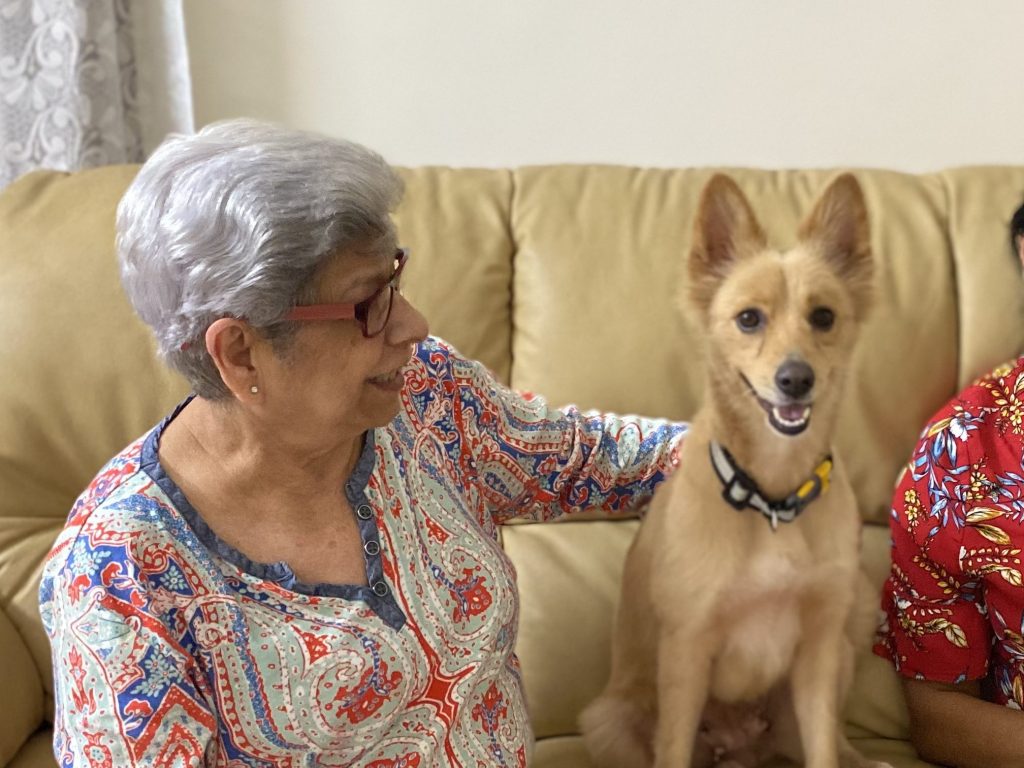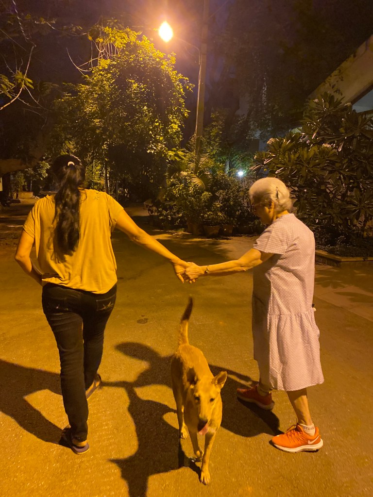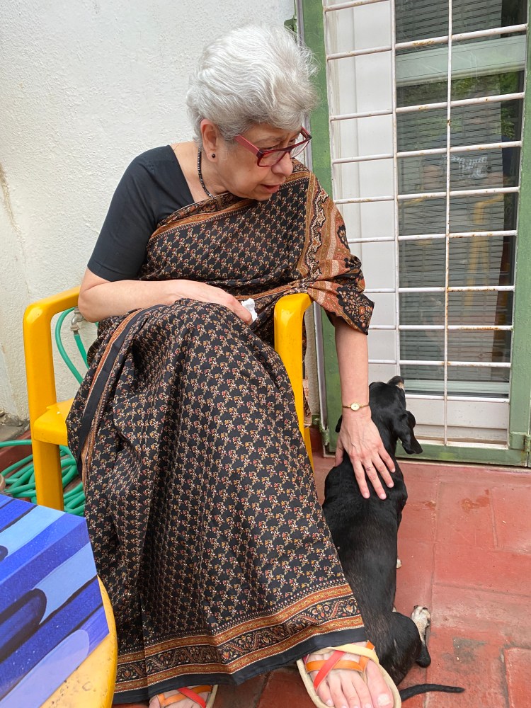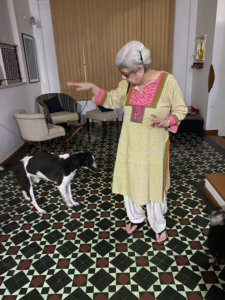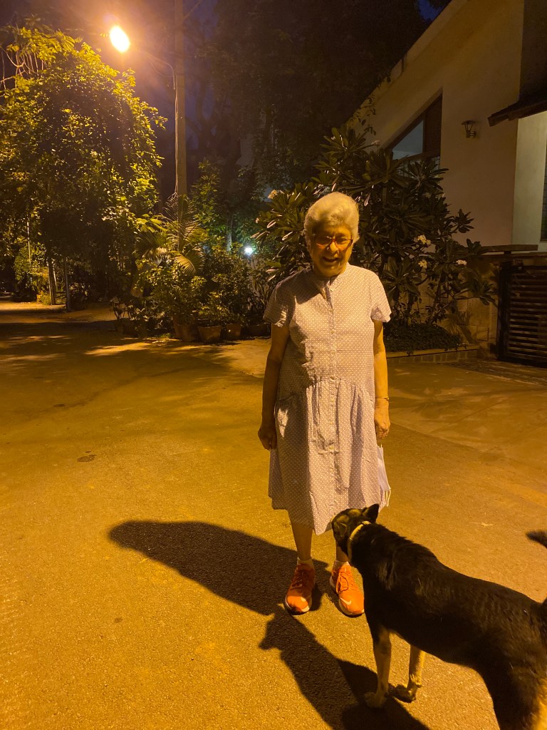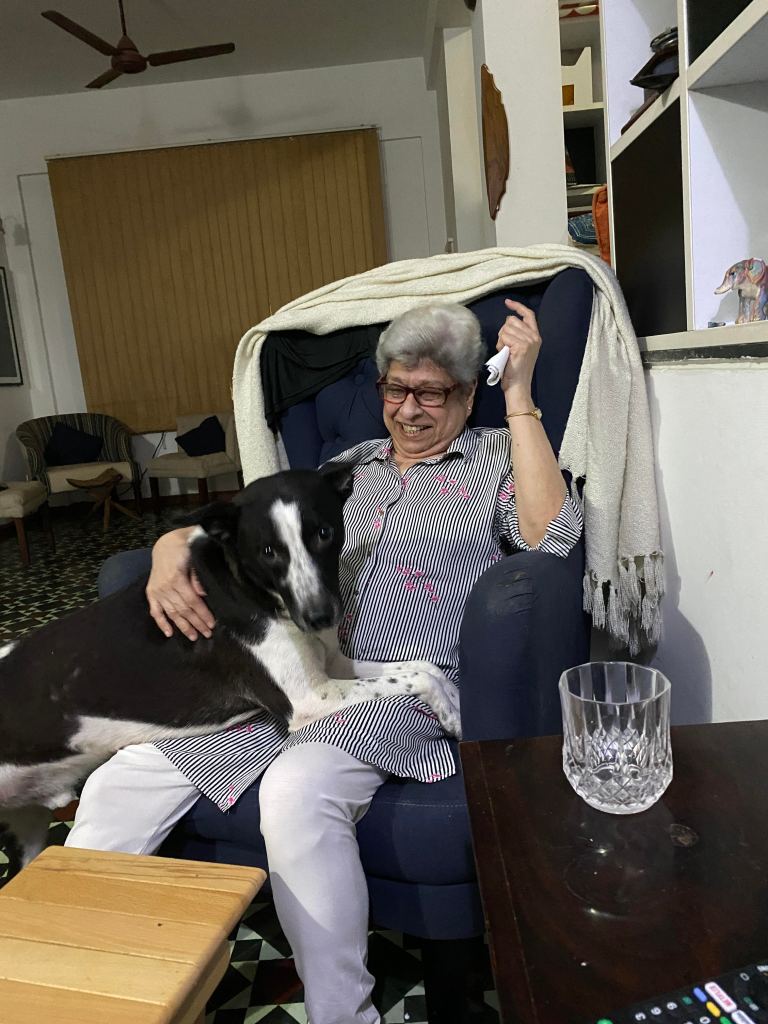 Millennial’s like us have made a trend out of sneaking into DMs of people we watch online on Instagram or facebook newsfeeds. Baby Boomer Gool did exactly the same after watching the time we hit the road for our evening walks and sleuthing about our involvement with community dogs and animals welfare! She met us near our house a few years back. She was clearly in wait. Stoically she asked that we solve a problem of a stray dog disturbing evening walks of her old relatives. Immediately our backs stiffened. But the way she said “old” relatives with a fierce body stance of a wild mustang and perfectly coiffed white hair amused us. It took a few days of work as the middle aged stray dog was grieving the loss of two of his mates but like other Community dog carers solve problems, we solved Gool’s problem. After a few evenings she snuck into our DMs aka our bell rings to a man who hands over a letter wrapped around what felt like a bottle.  “It’s nearing its expiry date and I am still half way through the previous bottle. I hate waste, please use it. My relatives can now walk freely in their lane. Thank you.” To our minds the gumption to send the Olay milk to us, virtual strangers, to avoid waste, was a gesture as cool as it was unique.  That’s how she sneaked into our busy offline work and farmer lives, became a friend, the first friend to visit Shibira and the kind of friend we have since wished on everyone. Being her friend and caring for her was a privilege. Our friendship grew organically. No Pity about the ‘oh poor elder living alone’ from our side and no judgment about ‘forever busy headless chicken couple’ from her side.