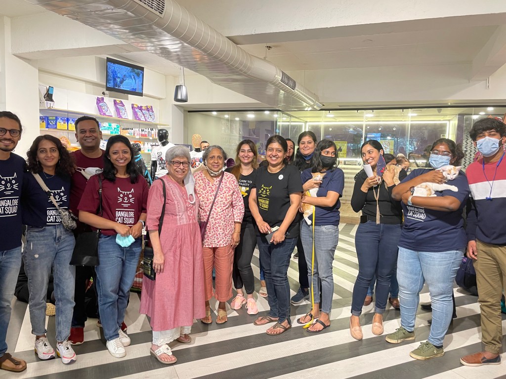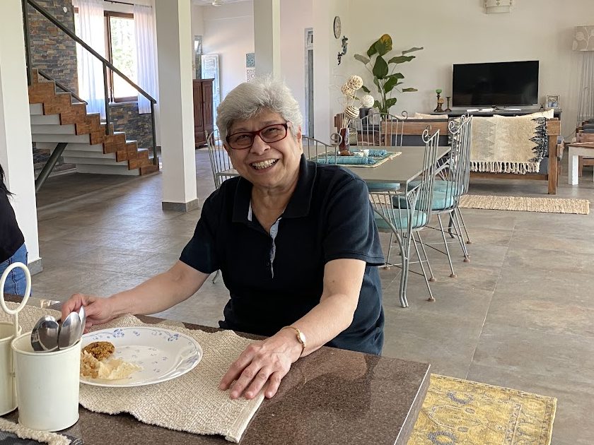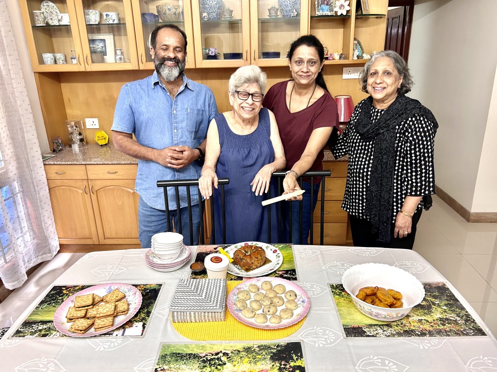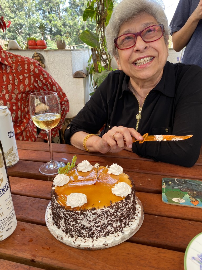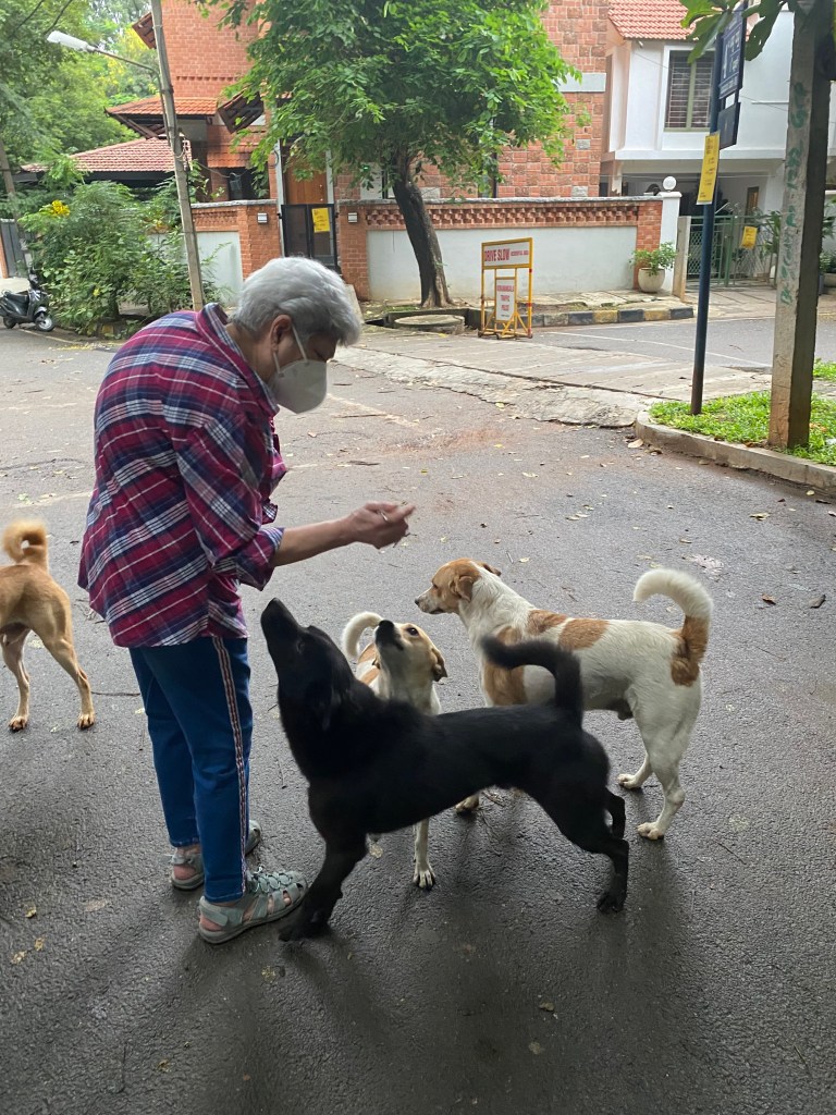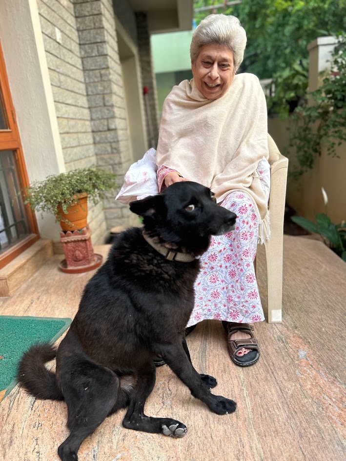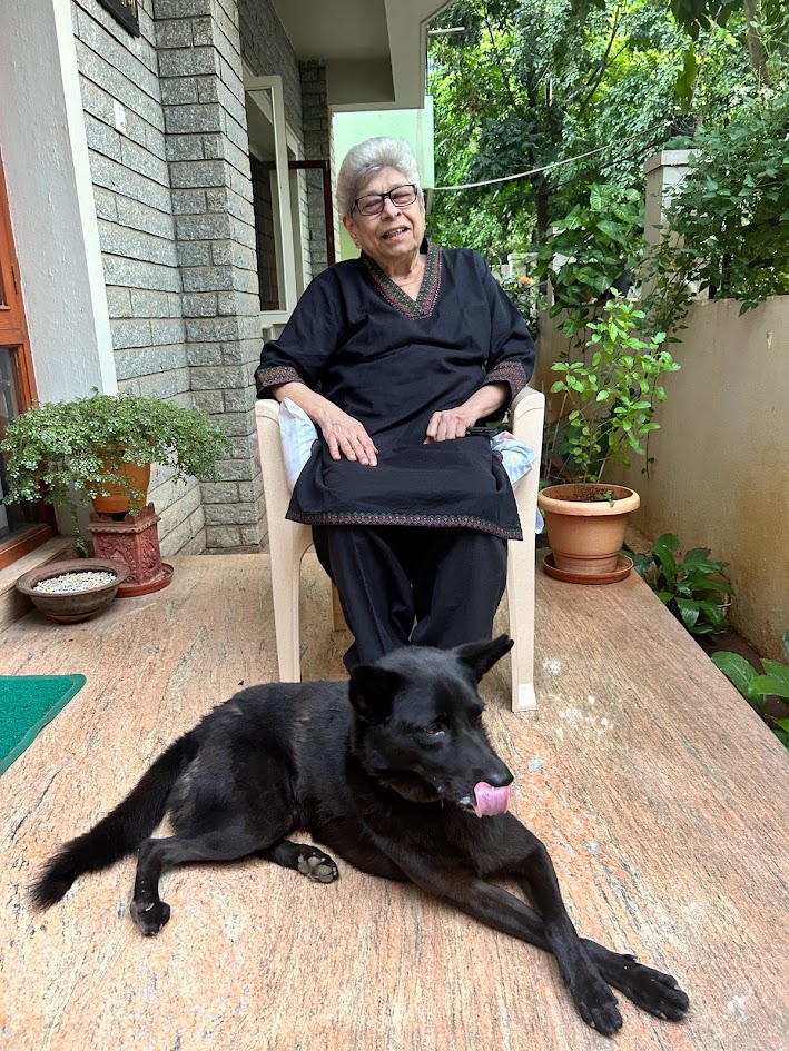 Priya who visits her parents in Winter, Gool’s neighbours says,” I would run into her on her daily walk in the evenings accompanied by her trusted local fandog and bodyguard, Mowgli aka Blackie, and her face would break into a wide and happy smile. Invariably delicious food, most often pau bhaji would follow. She was a knitter, and I benefited from that with two winter hats and a long scarf to add to my wardrobe, all of which come in very useful in climes less salubrious than Bengaluru.  I know that I will miss my first walk down Third Cross to the house on the crossroads to see her. As for Mowgli, I know he will be bereft. We all are. There’s a little less light in the sky as autumn turns to winter, One of my favourite memories is celebrating her birthday some time ago, when she set out a table full of her favourite foods surrounded by several of us, her friends. Even when she was ailing over the last year, she’d confess she was tired or fed up but still break into a smile that wreathed her face. Some people just find joy in other people and she was one of them.