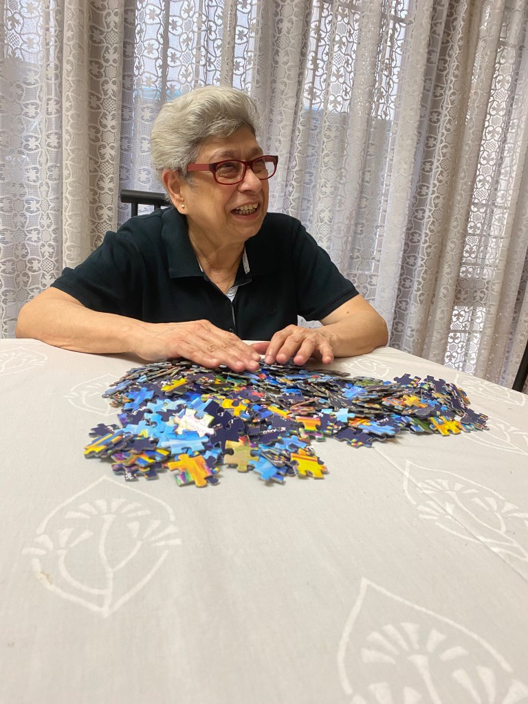 She got great delight that some of her Mandala paintings were sold in a fund raiser for street dogs and signed them happily. We should frame these , its nicer. We told her about Raj our favourite framer who would do it cheaply. Next thing we know she was preparing for a brisk walk to meet Raj to discuss a bargain price for framing many of her paintings. Please. you can’t risk getting covid in the ST Bed marketplace where his shop is. When her eyes started to ache with the painting, we introduced her to a puzzle from Holland. By the time she was not even done with it, she was her old smiling sunny self. The covid created depression was firmly behind her! After that she knew what to do ! Everytime she found herself slipping into a “mood” she had a plan which started with an instruction to us – Could you come today evening at 6. I have something to discuss!