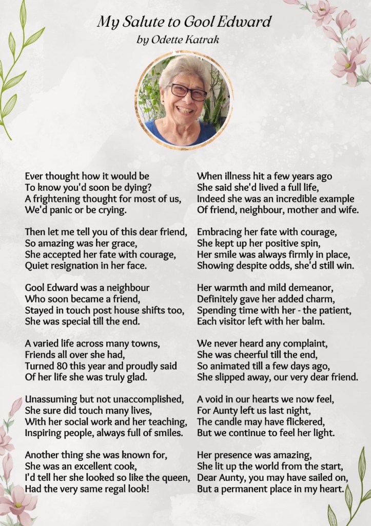 Sharing port wine as she lay in her death bed to celebrate her 80th birthday there were no tears, just a joint prayer from Gool and us that her end be eventless. Unlike her eventful life. It was a tall ask as we know now. Her spirit struggled to leave …was literally dying to leave the world.